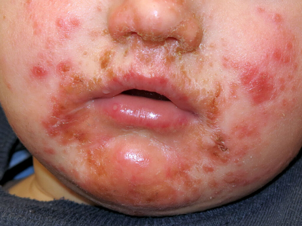 • Ne-bullozni impetigo (najpogostejši): Začne se kot rdeča lisa, ki preide v majhne mehurčke. Ti hitro počijo in pustijo rumenkaste kraste, podobne medu. Običajno se pojavi okoli ust in nosu.